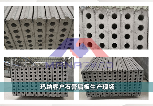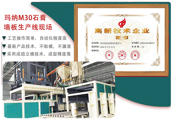 石膏墻板以建筑石膏為原料,加水攪拌,澆注成型的輕質建筑石膏制品。生產中允許加入纖維、珍珠巖、水泥、河沙、粉煤灰、爐渣等等,擁有足夠的機械強度。瑪納公司可提供一種全自動石膏墻板設備,該生產線是在新研制機動成組立模墻板成型工藝的基礎上,引進先進的石膏墻板生產工藝,經過技術創新,研制出的新型石膏墻板生產線,生產的石膏墻板具有成型"精準高、輕質高強、耐水、防火"等特性。其生產線設備組成主要有:第三代成組立模、第三代液壓抽芯機、合板翻板機構、上抹面成型定位機構、自動圍擋刮面機等。