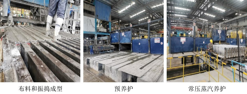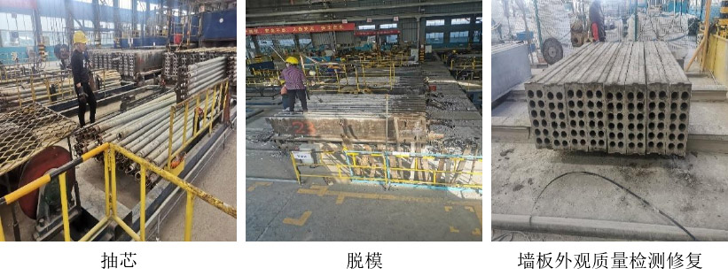 之后進(jìn)行抽芯處理,經(jīng)過(guò)表面質(zhì)量檢測(cè)和修復(fù)后,開(kāi)始進(jìn)行蒸壓養(yǎng)護(hù)處理,蒸壓養(yǎng)護(hù)過(guò)程分為升壓、恒壓、降壓三個(gè)過(guò)程:升壓階段(15min 0.10MPa;30min 0.25MPa;45min 0.35MPa;1h 0.50MPa)、恒壓階段(2h、0.5±0.05MPa)、降壓階段(15min 0.40MPa;30min 0.30MPa;45min 0.20MPa;1h 0.15MPa;1h15min 0.10MPa;1h30min 0MPa)、降溫冷卻 30min。