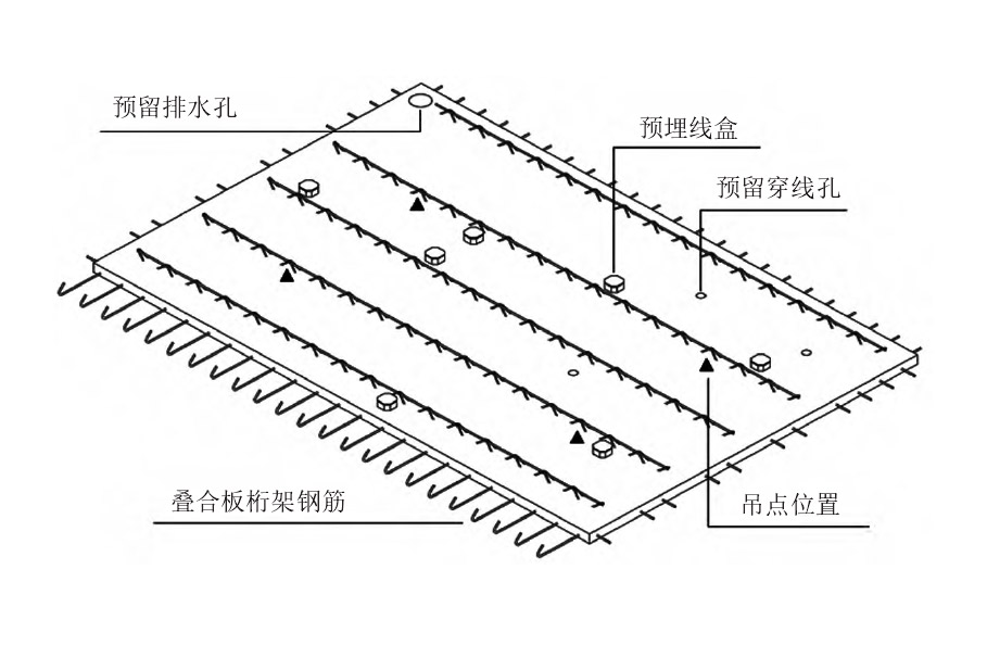 一般由設計院根據建設單位的意圖,按照現澆的標準和要求進行結構設計。預制構件廠在施工圖的基礎上進行拆分,將整體建筑拆分成單一構件,在充分協調各個專業之后,確保專業之間無碰撞,即完成圖紙的深化設計,深化設計圖紙包括預留預埋點位、脫模、吊裝點位及結構配筋詳圖的做法和要求,深化設計圖紙可以滿足構件加工生產和現場安裝的需求,本研究以疊合板深化設計詳圖為例,深化設計如下圖所示。