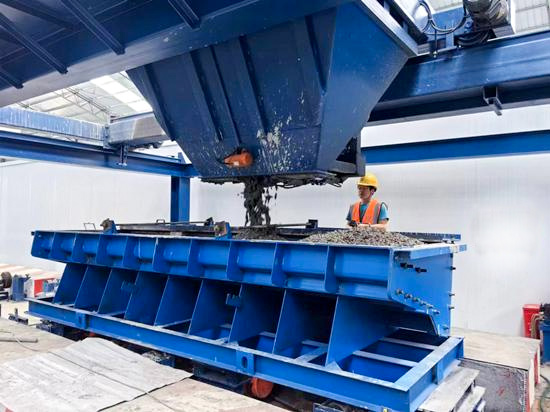 該生產(chǎn)線包含六大功能區(qū):包含鋼筋籠制作區(qū)、混凝土澆筑區(qū)、蒸汽養(yǎng)生區(qū)、拆模清理區(qū)等,各區(qū)域由軌道串聯(lián)成一個環(huán)形整體,區(qū)域間配備了機械臂、擺渡車和移動小車,實現(xiàn)工序無縫銜接。