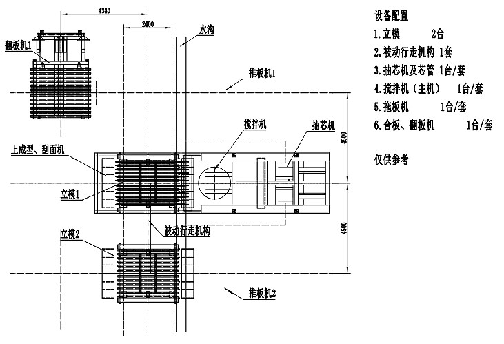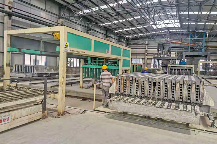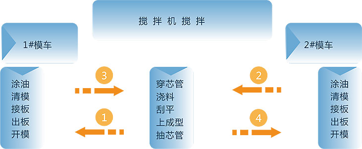 配置1號模車準備穿芯管,布網、澆筑,刮平,上成型,抽芯管等待出板;