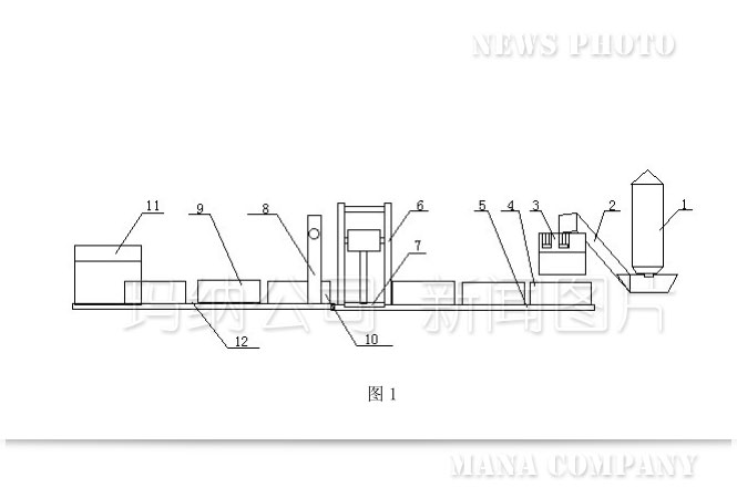通過攪拌混料裝置1將水泥、沙子混合后再通過輸送裝置2輸送至下游的的高壓注漿裝置3,高壓注漿裝置3是將混料通過高壓注漿器注射至接受箱4內(nèi),再經(jīng)過接受箱循環(huán)移動裝置5的循環(huán)移動,其上的接受箱4內(nèi)的無極水泥、沙子、發(fā)泡劑、粘結(jié)劑在一定時間內(nèi)膨脹且凝固成模塊8,再通過起膜裝置6使接受箱4內(nèi)的所述模塊8與所述接受箱4脫離,通過推進(jìn)裝置7將脫離接受箱4的模塊10推至下游的切割裝置8,脫離后的接受箱4可在接受箱循環(huán)移動裝置5上繼續(xù)循環(huán)使用,模塊8通過下游的切割裝置7切割成一定規(guī)格的保溫板9并通過分支輸送裝置12送至發(fā)泡保溫板包裝機(jī)11上進(jìn)行包裝,實現(xiàn)了阻燃效果好,自動化程度高,生產(chǎn)成本低,生產(chǎn)效率高的效果。