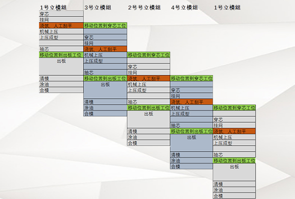 2. 穿芯工位:成組立模機對位定位,操作抽芯機完成穿芯動作,過程中人工對芯管做噴油處理。注意芯管是否準確穿入,如芯管出現錯位過多,應立即停止;噴油盡可能均勻噴涂,采用油性脫模劑。