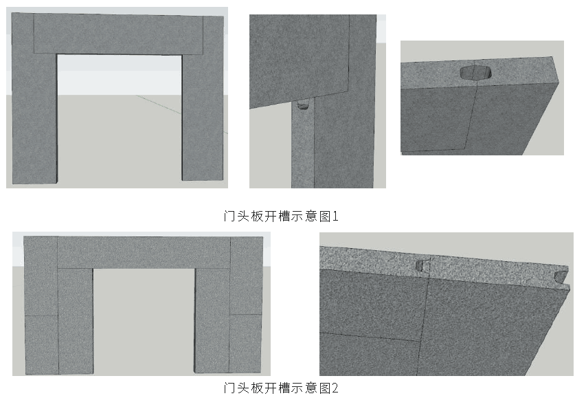 門頭橫板兩端搭接100~150mm,兩端豎板呈“L”型。首先進行板材切割:門口豎板切割出“L”形,門口豎板上與門頭板連接橫縫、豎縫位置人工鑿出凹槽。門頭板安裝時凸頭向下,同時在其兩端人工鑿出凹槽。然后安裝:門頭板安裝時先將橫縫位置鋪滿砂漿,待門頭板與砂漿坐實后,將灌漿料灌入豎縫位置,保證灌漿料灌實。