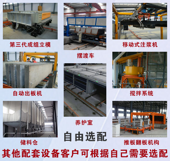 攪拌系統、集約養護室、擺渡車、合板翻板機、EPS儲料倉等;還有一些輔助設備,客戶可以根據需求自由選配。
