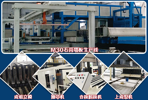 為實現石膏空心隔墻板自動化目的,該石膏空心隔墻板機M30石膏墻板生產線包括,自動圍擋刮面機、上抹面成型定位機構、合板翻板機構、第三代液壓抽芯機、第三代成組立模等。該生產線生產的石膏空心隔墻板具有成型"精準高、輕質高強、耐水、防火"等特性,從研發至今一直深受客戶的好評。